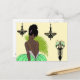 Nuestro hermoso Bianca con el pelo negro, vestido de menta verde y blanco. Bianca está adornada con joyas y tiene un ventilador de plumas verde kiwi. Lámparas negras y candelabros en un fondo amarillo pálido.