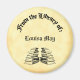 Un imán personalizado que dice 'De la Biblioteca de' y espacio para su nombre en letras antiguas y una pila de libros antiguos en un estilo de arte grabado antiguo en blanco y negro.