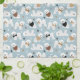 Bichón lindo frita perros en sudaderas y arcos con huesos de perro dispersos y huellas de pata en toallas de cocina de fondo azul claro.