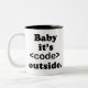 Dice "Baby It's Code Outside" un juego de palabras en la famosa canción y una referencia a la codificación de computadoras o al programador. Sugerencia como regalo para personas involucradas o interesadas en software o desarrollo.