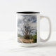 Esta taza ofrece un árbol desnudo interesante con un solo cuervo pearched en el top y un cielo nublado hermoso como contexto. Foto tomada en el Gran Cañón.