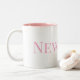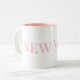 Esta es una gran taza de café blanca, el color interior es rosa, con la palabra NUEVA YORK escrita en ella, rosa. Es una ciudad muy bonita y de gama alta.