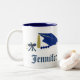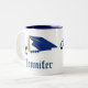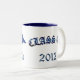 Taza preciosa del regalo para su mayor de graduación del favorito, con los gráficos elegantes de un diploma y de un casquillo azul del mortarboard. El texto gráfico azul lee la clase de, y el texto adaptable azul lee el año y el nombre del graduado. Personalice para sí mismo o su graduado preferido.