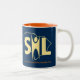 Una taza que es azul en el exterior y el naranja dentro, ofreciendo el logotipo de SHL.