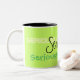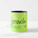 Seriamente taza de café - fondo de la verde lima con el texto negro, verde y amarillo - cuántas maneras pueden usted decir seriamente