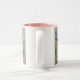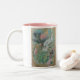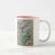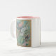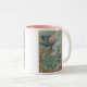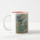 Esta taza del dos-tono ofrece un dibujo en colores pastel de un colibrí y de una polilla en medio de las flores. Los colores son verdes predominantemente suaves, azules y rosas. Este diseño parece el mejor en una taza blanca pura, un dos-tono con el interior rosado o verde oscuro, o una taza del campanero con la manija y el borde verde oscuro.
