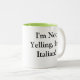 Taza del café con leche con el interior verde con el italiano diciendo "que no estoy gritando, soy italiano"