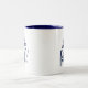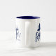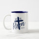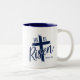 La taza de café se muestra en azul marino y blanco con una impresión de Él ha Resucitado.