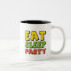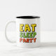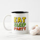 Crea un diseño divertido, enérgico y moderno centrado en el tema "Comer, dormir, Fiesta". Este diseño se usará en varios formatos, como camisetas, posters, pegatinas y gráficos digitales, y atraerá a una audiencia joven y saliente. El diseño debe transmitir un ambiente animado y despreocupado, sin dejar de ser visualmente atractivo.