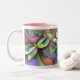 Esta taza de la libélula ofrece una libélula pintada a mano de la acuarela que fue dada el aumento digital del color del arte y un fondo digital de los fractales del arte.