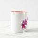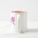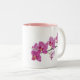 Una orquídea rosada hermosa imprimió en la taza blanca del fondo con rosa a juego en el interior de la taza. Perfeccione para la oficina o el uso en el hogar.