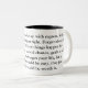 Taza de café personalizada de 444ml. ¡En cuanto a tamaño sólo puedo decir que enorme! pero es lo que esperaba así que estupendo. En el asa me entra la mano entera y no sólo tres dedos como me ocurría con las otras tazas. También comentar que es el tamaño que se ve en las series americanas, tanto para café como para infusión. En cuanto al acabado decir que es correcto, con poco tiempo de uso no puedo especificar mucho más. Pude escoger el nombre y el color pero no la tipografía, quizás esa elección pueda decidir a más gente. En términos generales y por el momento, buena opinión.