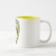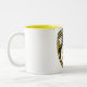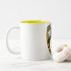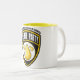 Taza blanca y amarilla con el logotipo del fiesta del pis del amarillo y del negro