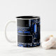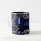 Diseño moderno que ofrece un cierre para arriba de una placa de circuito del ordenador en azul, blanco y negro, y de sus iniciales en azul. Taza con un diseño adaptable para que usted personalice con su propio texto, imágenes e ideas. Creado usando una fotografía original y técnicas digitales por Jess Perry.