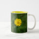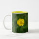 Esta taza ofrece un solo ranúnculo brillante, alegre, amarillo, ranúnculo, flor contra un fondo verde veraniego. El ranúnculo se asocia simbólicamente a menudo a cheerfulness, a encanto, a infantilismo y a riquezas.