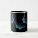 Fotografías de las características del diseño de una mariposa púrpura Rojo-manchada. Sus alas azules de neón realmente destacadas en el fondo negro.