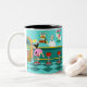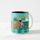 Sirva para arriba algo especial con esta taza retra de la fuente de soda. El arte minimalista, características del diseño del dibujo del dibujo animado el interior del punto más fresco de la ciudad. ¡Es una fuente de soda de los años 50, en toda su gloria kitschy! Contra el contexto del aguamarina pared, podemos ver los posters el hacer publicidad de las especialidades de la casa. Un poster muestra una hamburguesa y una botella de estallido para el precio de saldo de 15 centavos. El otro poster muestra a dos cucharadas de helado en un cono del azúcar para simples 5 centavos. ¡Con precios tenga gusto de éstos, él debe ser difícil mirar su cintura! Un tirón de soda más competente está sirviendo el contador verde azulado con acentos amarillos. El hombre joven con los éticas de trabajo fuertes está sosteniendo un cono de helado con una sola cucharada del helado amarillo limón--¡aunque, ser justo, podría ser piña! El chaval del limpio-cut está llevando una camisa prístina, blanca con un negro, la pajarita y un gorra blanco con acentos rojos. En el lado opuesto del contador, vemos tres taburetes de bar rojos y del cromo. Se encarama en uno de los taburetes un teenybopper rubio cuya boca está regando seguramente. Es confuso si su boca está regando sobre el cono de helado que se dirige su manera o el hombre joven industrioso que la está sirviendo. Ella está llevando una falda rosada del caniche y un top del negro del ajuste de forma. Sus cerraduras amarillas se tiran en una cola de caballo clásica. Al lado de este cutie de un cliente hay una máquina tocadiscos colorida, clásica, que ofrece el grano marrón, de madera, el revestimiento de madera y luces de neón coloridas. ¡Mejore que eso, él está seguro de ofrecer todos los golpes más grandes del rock-and-roll del tiempo! El piso de esta sala de helado moderna de los mediados de siglo es aguamarina y el trullo, el modelo del tablero de damas que apenas está gritando para que alguien intente toda la última danza se mueve.