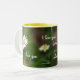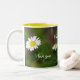 Taza alta, amarilla y blanca con las margaritas en jardín y texto "te amo" y "te amo para siempre y siempre."