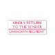 Este sencillo diseño de sello de goma incluye los mensajes "BIEN REGRESAR AL ENVÍO" y "DESCONOCIDO RECIPIENTE". Podría utilizarse para indicar que el correo recibido se ha entregado a la dirección equivocada o que el destinatario es desconocido y debe devolverse al remitente.