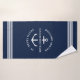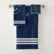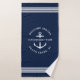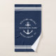 Toalla náutica de baño en azul marino que dice "bienvenido a bordo", así como el nombre y la ubicación de la embarcación personalizado.