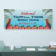 La pancarta de bienvenida para cualquier evento tropical o de playa muestra loros, palmeras y flores. Editar todo el texto para el evento. Ideal para luau, fiesta tiki, reunión familiar, cumpleaños o cualquier evento.