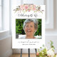 Mis condolencias por tu pérdida. Honra a tu ser querido con un delicado letrero de bienvenida para funeral con un exquisito diseño floral de acuarela pintado a mano en la parte superior y la frase "Celebrando la vida de" en caligrafía moderna y elegante. Variedad de tamaños para elegir. Detalle floral en tonos rosa claro, crema, rosa, dorado rosa, malva y púrpura. Invitación para funeral/celebración de vida, libro de firmas, notas de agradecimiento y programa coordinados disponibles. Parte de nuestra colección "Delicado Funeral, Memorial".