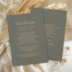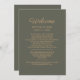 Carta de bienvenida o itinerario de boda de color verde oliva de doble cara para la bolsa de bienvenida de sus huéspedes al llegar para su fin de semana boda. Puede añadir cualquier cosa a esta tarjeta que sus invitados puedan necesitar. Darles información sobre la cronología de los eventos para el fin de semana, información sobre las atracciones locales en las que puedan estar interesados, o cualquier cosa que usted piense que necesiten saber antes de la ceremonia de su boda y hasta su fecha. El color de fondo de esta tarjeta es totalmente personalizable, así que diseñe el suyo para que coincida con su propio tema boda.