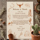 Bienvenidos a sus huéspedes con encanto rústico y sincera gratitud, utilizando esta nota boda de inspiración occidental de Boho. Con tonos tierra, botas de vaquero o gorras para ese perfecto toque campestre, esta hermosa tarjeta combina la elegancia de los boho del desierto con el estilo occidental.