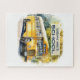 Un rompecabezas con una imagen de un autobús escolar retro y un texto: Bienvenido de vuelta a la escuela.