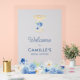 Elegante Señal de Bienvenida de Pétalos Florales Azules y Prosecco. ¡Brindemos, brindemos, hurra! 🥂establece el tono para tu fabulosa celebración de despedida de soltera. Con flores hermosas y un fondo azul claro, esta señal de bienvenida seguramente será un éxito. Artículos coincidentes en nuestra tienda Diseño de Fiesta Cava.