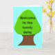 Una tarjeta con una divertida imagen digital de un árbol con una parte superior verde y un baúl marrón sobre un fondo azul cielo. En la parte delantera de la tarjeta dice, en texto negro, bienvenidos a la familia Bella. El texto es personalizable para que pueda cambiar el nombre o el texto completo. El interior de la tarjeta está en blanco, así que puede elegir añadir un saludo haciendo clic en el botón "personalizar" o dejarla en blanco y escribir a mano su saludo. Esta tarjeta ha sido diseñada para recibir a alguien nuevo en la familia, ya sea un recién nacido, un niño adoptado, recién casado o un pariente perdido durante mucho tiempo que encontró mientras investigaba el árbol familiar.