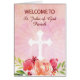 Tarjeta perfecta para recibir a un nuevo feligresor en su parroquia. Se ve una cruz blanca sobre un fondo acuarela con flores de bonito y rosas al pie de la cruz. ¡Personalízalo con el nombre de tu parroquia! Esta carta alegre refleja el ambiente acogedor.