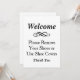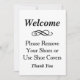 La tarjeta de bienvenida para mostrar durante las visitas a casa cuenta con un diseño personalizado clásico en blanco y negro: "Bienvenidos, por favor quitense los zapatos o usen cubrezapatos". Personalice el texto según su ocasión.