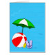 Una tarjeta de arte en blanco con un paraguas verde, una bola de playa roja y blanca con sandalias y aceite de sol contra un fondo oceánico de verano con olas azul turbio y verde azuladas.