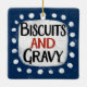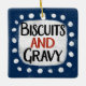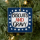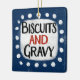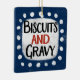 Un divertido y lindo diseño tipográfico de comida sureña que dice "Biscuits and Gravy". Tiene texto en negro y rojo sobre un rectángulo blanco con puntos blancos divertidos y juguetones rodeándolo, todo sobre un fondo azul.