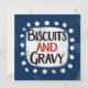 Un divertido y lindo diseño tipográfico de comida sureña que dice "Biscuits and Gravy". Tiene texto en negro y rojo sobre un rectángulo blanco con puntos blancos divertidos y juguetones rodeándolo, todo sobre un fondo azul.