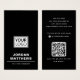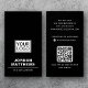 Color negro o personalizado, diseño moderno, profesional, vertical de tarjeta de visita con campos de plantilla para el nombre, nombre/título de la empresa, logotipo (foto u otro gráfico), código QR e información de contacto, incluidos iconos de medios sociales. Cambiar el color de fondo, mover y cambiar el tamaño de los elementos con la herramienta de personalización.