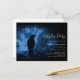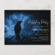 Invitación de cumpleaños con una imagen de un cuervo negro por la noche encaramado en una rama de árbol con ramas arriba que dice "cuervo negro". Moody y misteriosa vibra.