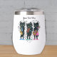 Esta bebida tumbler tiene tres gatos de jazz negros tocando sus instrumentos musicales. Una está vestida de azul, otra de verde y la mujer con falda rosa. Tienen un corazón hecho de notas de música negra detrás de ellos. Personalizar el texto con la plantilla.