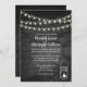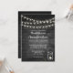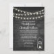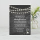 Las invitaciones a bodas de madera rústica en negro carbón vegetal presentan fondo de foto de grano de madera, luces de manga de cuerdas y frasco de albañil con una vela. Combina y combina esta invitación de boda con nuestra colección de artículos de papelería y favores bodas.