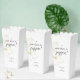 Los bodas disfrutan de un aperitivo sorpresa a medianoche. Esta encantadora caja de palomitas de maíz blanca favorece la boda y presenta nombres de pareja en un conjunto contemporáneo de fuentes negras, junto con elegantes y modernos esquemas florales de oro. Este elemento forma parte de una suite boda completa que incluye elementos estacionarios coincidentes.