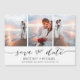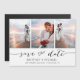 Elige las mejores fotos de tu sesión o de tus fotos favoritas de los dos para guardar la fecha. Las palabras que guardan la fecha están escritas a mano para darle un toque personal a la tarjeta. La parte frontal tiene 3 imágenes y la parte posterior tiene una imagen grande con un filtro blanco encima.