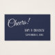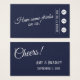 ¿Quieres ofrecer a tus clientes una forma de tomar varias bebidas alcohólicas durante tu recepción o fiesta sin comprometerte con un bar abierto? ¡Estos boletos de bebida de 3 ponches podrían ser ideales para usted! En un audaz alfabeto blanco moderno, el mensaje en el frente dice "¡Tomen algo de bebidas sobre nosotros!". El texto es editable, si desea un mensaje diferente. Rotado, a la derecha y colocado entre líneas delgadas están las palabras "Redactar en la barra"; este texto también es editable. A la derecha se han añadido tres círculos numerados para que los clientes puedan sacar sus tarjetas en el bar, ya que se sirven hasta tres bebidas complementarias. Debajo de la palabra "¡Saludos!" el otro lado tiene campos de plantilla configurados para sus nombres y fecha. Simplemente utilice los campos de plantilla para agregar sus datos personales y volver a escribir cualquiera de las frases. Todas las capas se agregaron sobre un fondo azul marino sólido editable/medianoche; cambie este color a lo que desee, para que coincida con su paleta boda. Diseñado por Melody Watson para la Muserie de Papel.