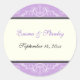 Personalizado de boda blanco púrpura de borde ornamental Save the Date pegatina, con un hermoso borde ornamental morado y blanco con rollos sobre fondo de marfil.