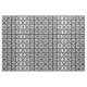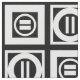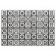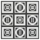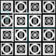 La tela geométrica de diseño presenta cuadrados blancos con un espacio entre ellos sobre un fondo negro. Los cuadrados gruesos opuestos diagonalmente contienen cada uno un círculo blanco delgado con un signo igual de grueso dentro. En cambio, los cuadrados finos contienen cada uno un círculo blanco grueso que toca los bordes del cuadrado con un signo vertical delgado igual en el interior. Imagen creada digitalmente. Copyright © 2015 Claire E. Skinner. Todos Los Derechos Reservados.