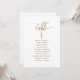 Ayude a sus invitados a encontrar su mesa con estas elegantes tarjetas de plan de asientos modernas con nombres de invitados. Tarjetas a doble cara para que los invitados puedan buscar desde ambos lados, delantero o trasero, sus nombres. Espacio claro alrededor que le da la libertad de usar clips o perforar un agujero para exhibiciones colgantes, o usar un soporte de mesa. Fondo blanco y texto en dorado. Detalles de caligrafía moderna a mano. Parte de nuestra colección "Papel de carta de boda de caligrafía elegante". Visite toda la colección en: https://www.zazzle.com/collections/elegant_calligraphy_minimalist_wedding_stationery-119497981924462546