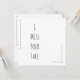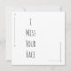 Blanco y negro básico. Adorada por una serie de líneas y formas delgadas, esta tarjeta dice "Extraño tu cara". Todo lo relacionado con este diseño es editable; el cambio más fácil es actualizar el mensaje si desea un mensaje diferente. Haga clic para realizar más modificaciones si desea cambiar los colores, la fuente o la posición. Hay mucho espacio en la parte de atrás para escribir un mensaje personal.