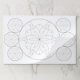 Patrón de Mandala dentro del círculo. Tres pequeños círculos tocan el gran círculo a cada lado. El patrón central es de seis segmentos de curvas o ángulos. Color con lápices, lápices, lápices o pinturas.