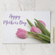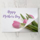 Un hermoso guión morado dice 'Feliz Día de la Madre'. Tres tulipanes rosas acompañan el texto.