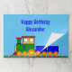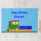 Las colocaciones de personalizado feliz cumpleaños hacen especial la celebración de cumpleaños de un niño. Un tren bonito está en las vías del ferrocarril. En la parte superior hay dos líneas de texto azul oscuro. Puede editar el texto para mostrar un mensaje personalizado y el nombre del niño. (Muestra: Feliz cumpleaños Alexander). Si lo desea, puede cambiar el número del tren para mostrar la edad del niño.